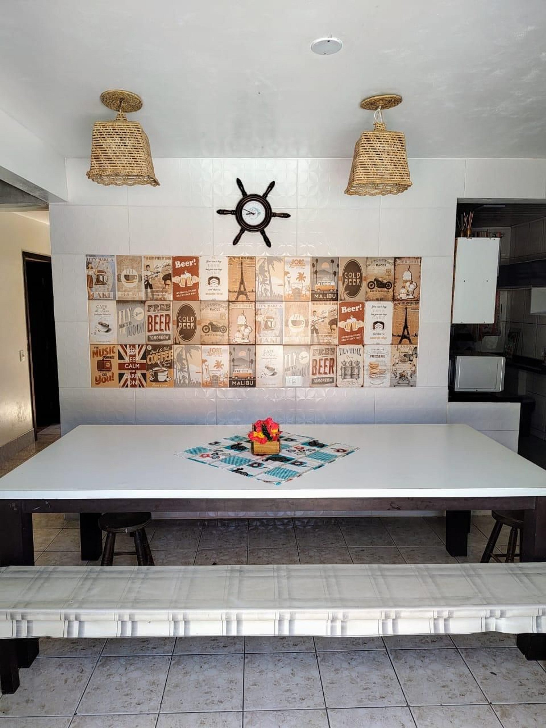 Uma sala com uma mesa de jantar enorme para bastante pessoas junto com a cozinha, para todos estarem juntos socializando e confraternizando. Logo em frente a porta principal há a linda piscina aérea, junto com um espaço de jogos e lazer, com mesa de bilhar e churrasqueira.