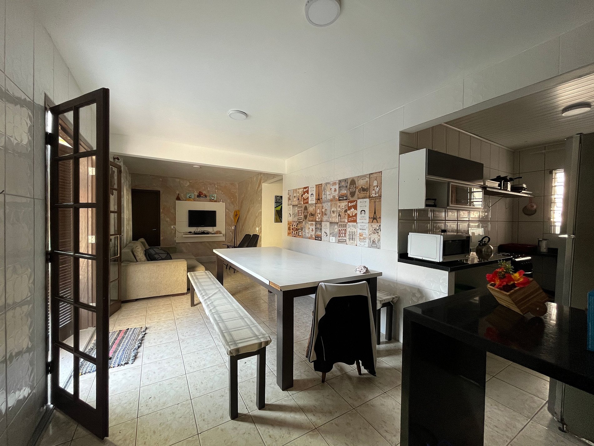 Uma sala com uma mesa de jantar enorme para bastante pessoas junto com a cozinha, para todos estarem juntos socializando e confraternizando. Logo em frente a porta principal há a linda piscina aérea, junto com um espaço de jogos e lazer, com mesa de bilhar e churrasqueira.